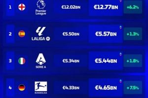 1、英超 127.7亿欧,上涨6.2%
